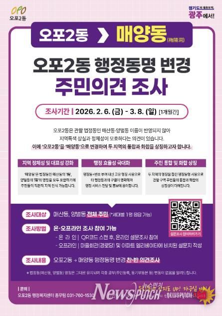 뉴스펀치 박상훈 기자 | 광주시 오포2동은 지역 정체성을 반영한 행정동 명칭 변경을 위해 2월 6일부터 3월 8일까지 오포2동 전 세대를 대상으로 주민 의견 조사를 실시한다고 4일 밝혔다.