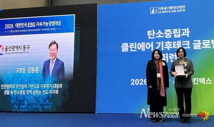 뉴스펀치 김윤걸 기자 | 울산 동구는 환경일보와 한국환경경영학회가 공동으로 주최하는 2026 대한민국 ESG 지속 가능 경영대상에서 전국 19개 대상 수상기관 중 하나로 선정되는 영예를 안았다.