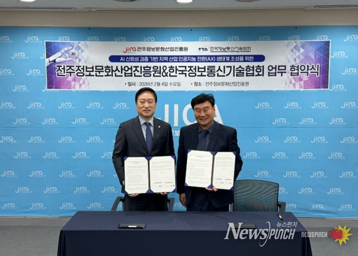 뉴스펀치 최영남 기자 | 전주시 출연기관인 전주정보문화산업진흥원은 4일 진흥원 멀티미디어기술지원센터 1층 세미나실에서 한국정보통신기술협회와 AI 신뢰성 검증 기반 지역 산업 인공지능 디지털 전환(AX) 생태계 조성을 위한 업무협약을 체결했다.