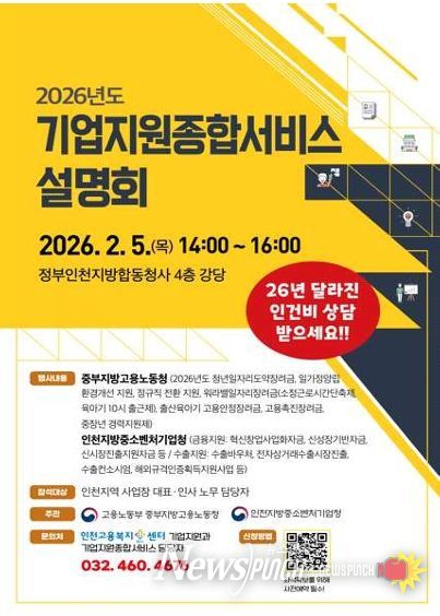 뉴스펀치 조평훈 기자 | 중부지방고용노동청(청장 김윤태)은 2026년 2월 5일 오후 2시 정부인천지방합동청사에서 인천지역 중소기업 170여개사를 대상으로 인천지방중소벤처기업청과 함께'기업지원종합서비스 설명회'를 개최한다