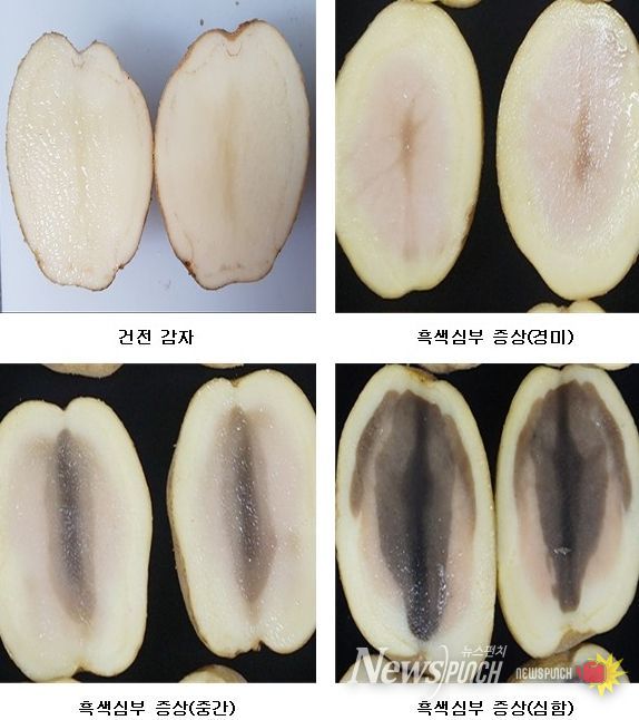 ‘흑색심부’는 감자 내부 조직이 검게 변하는 생리장해로, 밀폐된 상태에서 장기간 저장하거나 수송할 경우 감자의 호흡 과정 중 산소 공급이 원활하지 않아 발생한다.