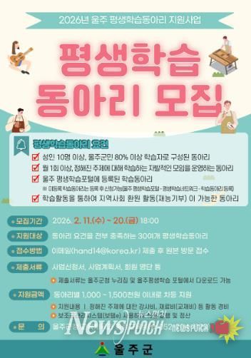 뉴스펀치 김윤걸 기자 | 울산 울주군이 오는 11일부터 20일까지 ‘2026년 우수 평생학습동아리 지원사업’ 참여 동아리를 모집한다고 5일 밝혔다.