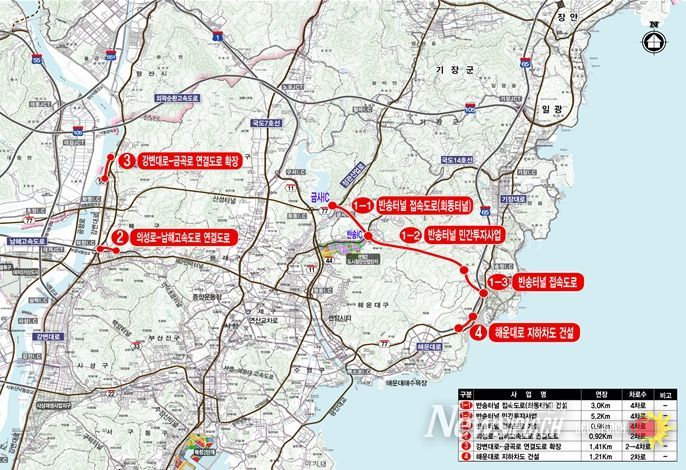 4개 사업은 총 6천539억 원 규모로, ▲반송터널 ▲의성로~남해고속도로 연결도로 ▲강변대로~금곡로 연결도로 확장 ▲해운대로 지하차도 건설 사업이다.