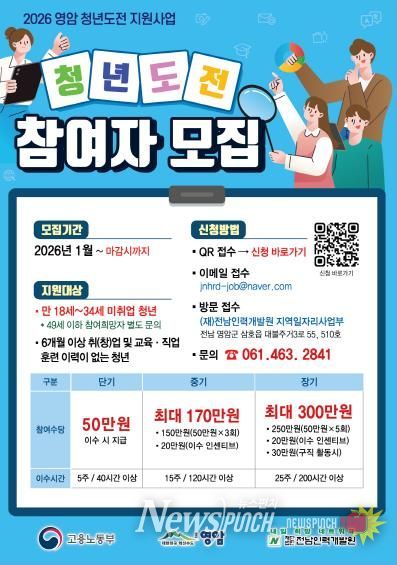 뉴스펀치 김용희 기자 | 영암군이 (재)전남인력개발원과 ‘2026년 영암군 청년 도전 지원사업’ 참여자를 모집 중이다.