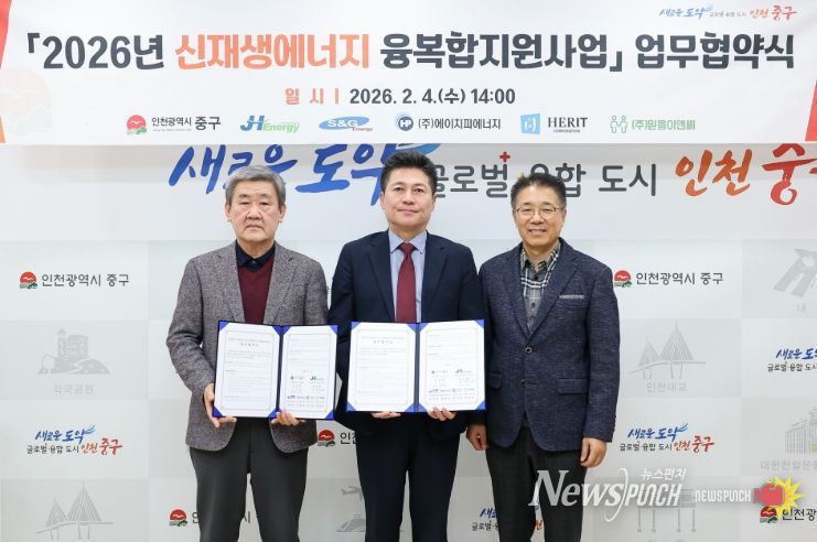 김정헌 인천 중구청장은 지난 4일 중구청 구청장실에서 컨소시엄 참여기업 5곳(㈜제이에이치에너지, ㈜에스앤지에너지, ㈜에이치피에너지, ㈜헤리트, ㈜믿음이앤씨)과 ‘2026년도 신재생에너지 융복합지원사업 업무 협약’을 체결했다.