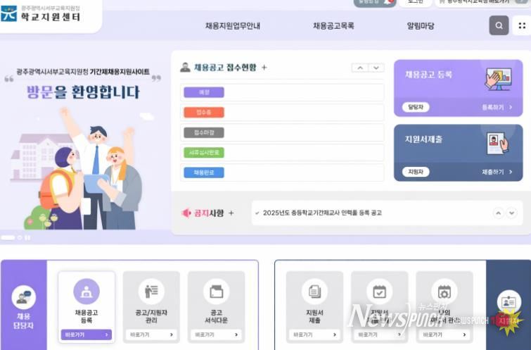 광주서부교육지원청은 각 학교의 ▲채용 공고 ▲서류 접수 및 심사 ▲합격자 서류 학교 이송 등을 지원해 원활한 채용이 이뤄지고 인사행정의 공정성도 확보할 계획이다.