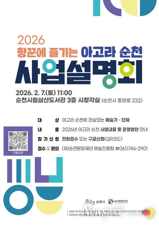 뉴스펀치 김용희 기자 | (재)순천문화재단은 오는 7일 11시, 순천삼산시립도서관 시청각실에서 지역예술인과 시민을 대상으로 ‘2026 항꾼에 즐기는 아고라 순천’ 사업설명회를 개최한다.
