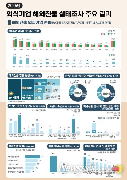 농림축산식품부와 한국농수산식품유통공사가 발표한 '2025년 외식기업 해외진출 실태조사'에 따르면, 국내 외식기업들은 미국, 중국, 베트남 등 전 세계 56개국에 진출하여 4,644개의 매장을 운영하며 글로벌 시장에서 상업적 성공사례를 써 내려가고 있다.