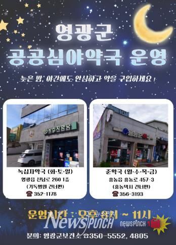 이번에 지정된 공공심야약국은 요일별로 운영되며, ▲녹십자약국은 화·토·일요일(영광읍 신남로 260 1층), ▲준약국은 월·수·목·금요일(홍농읍 홍농로 457-3)에 운영된다.