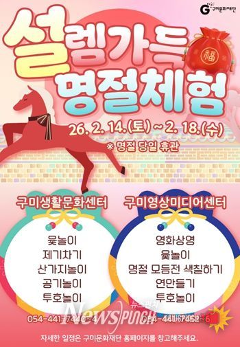 뉴스펀치 박세훈 기자 | (재)구미문화재단은 다가오는 설 연휴(2. 14. ~ 18.)를 맞아 구미생활문화센터와 구미영상미디어센터에서 시민과 귀성객을 위한 다채로운 문화 향유 프로그램을 운영한다고 밝혔다.