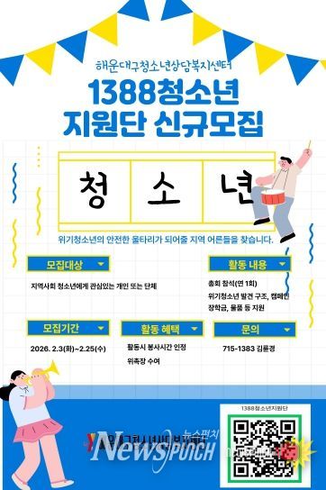 뉴스펀치 김윤걸 기자 | 해운대구 청소년상담복지센터는 지역 내 위기청소년들을 조기에 발견하고 든든한 울타리가 되어줄 ‘1388청소년지원단’을 이달 25일까지 공개 모집한다고 밝혔다.
