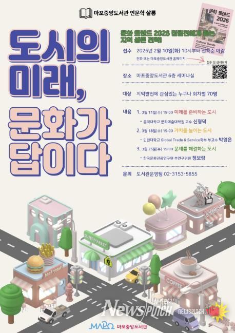 뉴스펀치 박상훈 기자 | 마포구는 구민의 인문학적 소양 증진을 위해 ‘도시의 미래, 문화가 답이다’라는 주제로 ‘인문학 살롱’을 개최한다.
