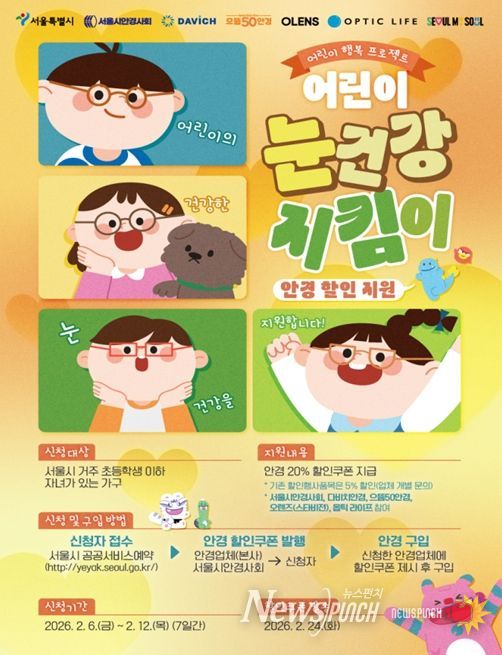 뉴스펀치 박상훈 기자 | 서울시가 새 학기를 맞아 스마트폰 등 디지털 기기를 자주 접하는 어린이들의 눈 건강을 위해 눈 검진(시력검사)과 최대 20%의 안경 구입 할인을 지원하는 ‘서울 어린이 눈건강 지킴이 사업’ 1차 신청을 받는다.
