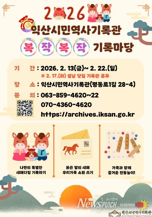 시 관계자는 "익산시민역사기록관은 시민의 일상이 기록으로 이어지는 열린 문화공간으로, 기록은 멀리 있는 것이 아니라 가족과 함께 웃고 즐기는 순간부터 시작된다"며 "설 연휴 기록관에서 가족의 소망과 추억을 남기는 뜻깊은 시간을 보내시길 바란다"고 말했다.