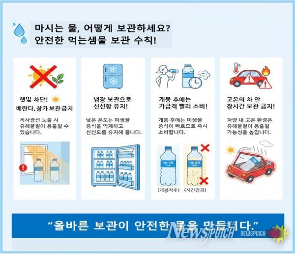 연구원은 먹는샘물은 직사광선을 피하고 서늘한 그늘에 보관해야 하며, 차량 내부에 장시간 방치하지 말고 개봉 후에는 가급적 빠르게 음용하는 것이 바람직하다고 당부했다.