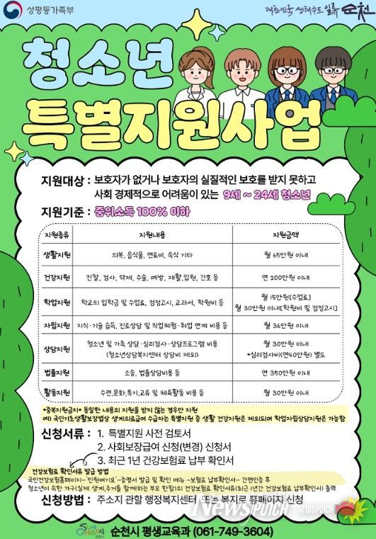 뉴스펀치 조평훈 기자 | 순천시는 청소년의 건강한 성장지원 및 자립을 지원하고자 오는 27일까지 ‘청소년 특별지원 사업’ 대상자를 모집한다고 밝혔다.