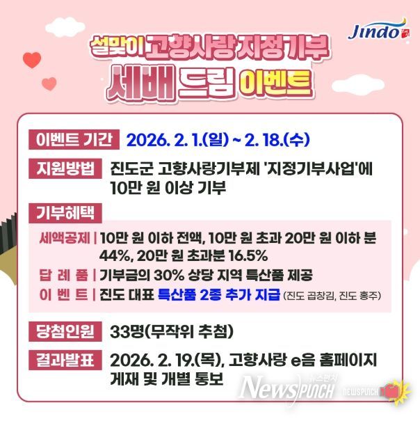 뉴스펀치 김용희 기자 | 진도군은 설 명절을 맞아 고향사랑기부제의 참여를 확대하고 지정기부사업을 홍보하기 위해 2월 1일부터 18일까지 ‘설맞이 세배 드림 이벤트’를 진행하고 있다.