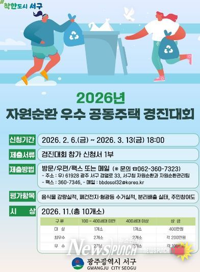뉴스펀치 최영남 기자 | 광주광역시 서구가 관내 100세대 이상 공동주택 204개소를 대상으로 ‘2026년 자원순환 우수 공동주택 경진대회’를 개최한다.