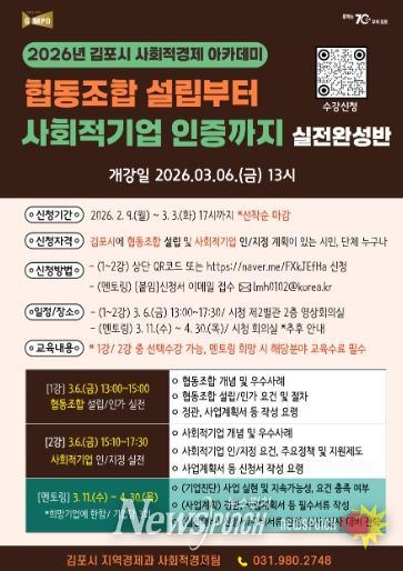 뉴스펀치 박상훈 기자 | 김포시가 사회문제 해결을 위한 참신한 아이디어와 실행력을 갖춘 사회적경제기업 육성을 위해 ‘2026년 김포시 사회적경제 아카데미’를 개설하고, 오는 3월 3일까지 수강생을 모집한다.