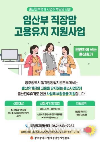 뉴스펀치 김용희 기자 | 광주광역시 일가정양립지원본부는 임산부 근로자의 출산 전후 휴가 등에 따른 부담금을 지원하는 ‘임산부 직장맘 고용유지 지원사업’ 대상 사업장을 오는 10일부터 선착순 모집한다.