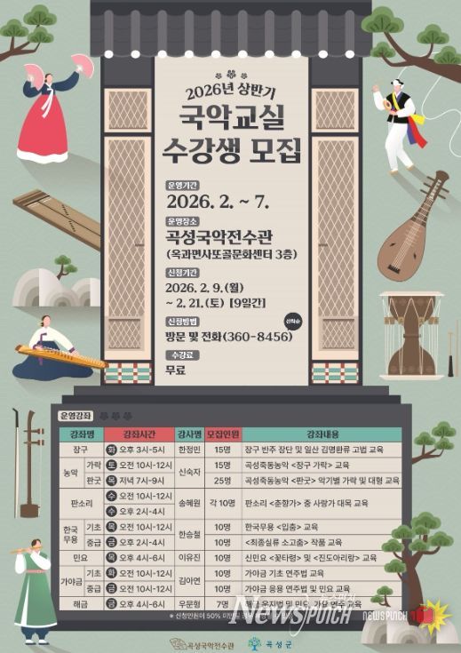 뉴스펀치 최영남 기자 | 전남 곡성군은 곡성국악전수관에서 운영하는‘2026년 상반기 국악교실’수강생을 모집한다고 6일 밝혔다.