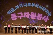 뉴스펀치 조평훈 기자 | 2025년 동구자원봉사자대회가 지난 16일 아양아트센터에서 개최됐다. ‘지금 여기, 나로부터 시작하는 자원봉사!’라는 슬로건으로 진행된 이날 행사는 600여명의 자원봉사단체 회원들이 한자리에 모여 축하공연, 영상 상영, 자원봉사 유공자 표창 등의 순서로 진행됐다. 홍창식 동구자원봉사센터 이사장은 “올 한 해 동안 우리 지역 곳곳에서 따뜻한 손길을 내밀고, 보이지 않는 곳에서 묵묵히 빛이 되어주신 자원봉사자 여러분께 감사의 마음을 전하며, 2026년에도 행복과 희망을 주는 동구자원봉사센터가 되기 위해 최선의 노력을 다하겠다”고 말했다. 윤석준 동구청장은 “2025년 한 해 동안 보여주신 자원봉사자 여러분의 헌신에 깊이 감사드리며, 이 행사를 통해 지역사회에 자원봉사가 더욱 확산되고, 나눔의 문화가 생활 속에 정착되는 계기가 되길 바란다”고 했다.