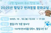 뉴스펀치 탁상훈 기자 | 수원시 팔달구는 10월 18일 오후 12시부터 17시 30분까지 팔달구청 정문 앞마당에서 ‘2025년 팔달구 반려동물 문화교실’을 개최한다고 밝혔다. 반려동물 문화교실은 성숙한 반려문화 확산과 올바른 반려동물 관리, 양육 방법을 알리기 위해 마련됐으며 반려동물 등록자 및 팔달구민 120명을 대상으로 추진한다. 교육 프로그램은 △인식표 만들기 △산책 그룹 훈련 △반려견 셀프 미용으로 총 3개 프로그램을 추진한다. 12시부터 진행하는 ‘인식표 만들기’는 반려견 유실 방지를 위해 동물등록번호와 견주 연락처를 새긴 맞춤형 인식표를 직접 제작할 수 있고, 14시부터는 ‘산책 그룹 훈련’에서는 산책줄 핸들링과 돌발 상황 시 대처법 등 및 올바른 산책 방법에 대해 배워볼 수 있다. 15시 30분에는 초보자도 쉽게 실천할 수 있는 ‘반려견 셀프 미용 수업’이 준비되어 있다. 팔달구 관계자는 “2025년 반려동물 문화교실 개최를 통해 구민들이 반려동물을 책임감 있게 관리하고, 올바른 반려 문화가 조성되길 바란다“라고 말했다. 한편, 팔달구는 구 홈페이지, 안내문자 및 QR코드를