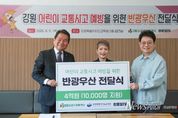 뉴스펀치 김보성 기자 | 강원특별자치도교육청은 9월 11일 오전 11시, 본청 접견실에서 DB김준기문화재단, DB손해보험, 한문철TV와 함께 ‘강원 어린이 교통사고 예방을 위한 반광우산 전달식’을 개최했다. 이번 전달식은 DB김준기문화재단의 사회공헌 활동의 일환으로 마련됐으며, 강원특별자치도 내 초등학교 1학년 학생들을 대상으로 총 1만 개의 반광우산을 지원한다. 반광우산은 야간이나 우천 시 운전자의 시야 확보를 도와 교통사고 위험을 줄일 수 있도록 제작된 안전용품으로, 학생들의 안전한 통학에 크게 기여할 것으로 기대된다. 전달식에는 신경호 교육감을 비롯하여 DB김준기문화재단 강은정 이사, DB손해보험 심재철 부문장, 한문철TV 한문철 변호사 등이 참석하여 교육청·기업·민간이 함께하는 교통안전 협력체계를 확인하는 자리가 됐다. DB김준기문화재단 관계자는 “작은 우산 하나가 아이들의 생명을 지킬 수 있다는 생각으로 이번 캠페인을 기획했다”며, “앞으로도 어린이 교통안전을 위한 사회공헌 활동을 지속해 나가겠다”고 밝혔다. 신경호 교육감은 “이번 반광우산 지원은 학생들의 안전한 등·하교를