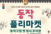 뉴스펀치 김완규 기자 | 동작구가 오는 11월 1일 오전 10시부터 오후 5시까지 구청 옛 청사 주차장(노량진역 5번 출구)에서 ‘2025 추억과 나눔이 오가는 동작 가을장터’를 연다고 밝혔다. 이번 행사는 주민과 단체가 직접 참여하는 ‘플리마켓’과 김장철 맞이 ‘직거래장터’를 한자리에서 즐길 수 있도록 기획됐다. 먼저 플리마켓은 약 30개 부스에서 의류, 도서, 소품 등 다양한 중고 물품을 판매하며 일상 속 자원순환 문화를 실천하는 장으로 마련된다. 직거래장터에서는 자매결연 도시 등에서 들여온 김장철 필수 품목(배추, 무, 고춧가루 등)과 지역특산물이 시중가보다 최대 33% 저렴하게 판매된다. ▲축산물 타임세일(11시·13시·15시) ▲선착순 증정품 지급 ▲당일 배달서비스(박스 단위, 관내 한정) ▲칼갈이 부스(인당 2개, 개당 100원) 등 다양한 이벤트도 진행된다. 아울러 주민들이 즐길 수 있는 ‘체험 프로그램(한지 무드등·편백 향낭 만들기 등)’과 구청 직원이 참여하는 ‘사랑 나눔 바자회’도 운영된다. 바자회 수익금은 동작복지재단 등에 후원금으로 활용될 예정이다. 이와 함께 군고