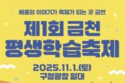 뉴스펀치 김완규 기자 | 금천구는 11월 1일 오전10시 금천구청 광장 일대에서 ‘제1회 금천평생학습축제’를 개최한다고 밝혔다. 축제는 ‘배움의 이야기가 축제가 되는 곳, 금천’을 주제로, 구 개청 30주년과 평생학습도시 지정 12주년을 기념해 마련됐다. 학습자, 동아리, 기관과 단체가 함께 어우러져 그동안의 학습 성과를 나누고 주민이 즐길 수 있는 학습문화 축제다. 축제 공간은 금천구 도시브랜드인 ‘행복도시, 학습도시, 문화도시, 상생도시’ 4개 구역으로 나뉘어, 공연·체험·전시·홍보 등 51개 프로그램이 운영된다. 관람객들은 각 도시를 여행하듯 공간을 이동하며 다양한 프로그램을 체험하고, 스탬프를 모으면 학습 이벤트 참여 기회를 얻을 수 있다. 주 무대인 썬큰광장에서는 시흥3동 주민자치 프로그램 ‘신바람 노래교실’의 축하공연을 시작으로, 금천시민대학과 평생학습 동아리들의 공연이 이어진다. 오후 1시 개막식에는 금천시민대학 ‘바른 자세와 모델워킹’ 수료생들의 특별 공연과 브라스 밴드 무대가 펼쳐져 현장을 더욱 빛낼 예정이다. 구청 광장에서는 인공지능(AI) 면접 체험, 디지털 그림그리기(페인팅),