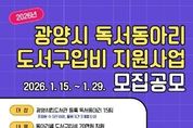 뉴스펀치 김용희 기자 | 광양시는 시민 독서문화 활성화를 위해'2026년 독서동아리 도서구입비 지원사업'에 참여할 독서동아리를 오는 1월 15일부터 1월 29일까지 모집한다. 이번 사업 공모는 생활 속 독서문화 정착을 목표로 추진되는 독서동아리 지원사업의 일환으로, 광양시립도서관에 독서동아리로 등록돼 3개월 이상 활동한 동아리 가운데 15개 팀을 선정해 동아리별 도서구입비 70만 원을 지원할 예정이다. 선정된 동아리에는 도서구입비 지원과 함께 도서관 교육실 등 동아리 활동공간을 무료로 제공하고, 동아리 역량 강화를 위한 교육 프로그램과 비경쟁 독서토론 참여 기회 등 다양한 지원도 병행할 계획이다. 전년도와 달리, 올해 사업은 독서동아리의 지속성과 실제 활동 실적을 보다 중점적으로 고려해 광양시립도서관에 사전 등록 후 3개월 이상 활동한 동아리를 대상으로 한다. 지원 대상은 사업 타당성, 수행능력, 활동 계획의 성실성 등을 기준으로 도서관 자체 심사와 광양시 지방보조금 심의위원회 심의를 거쳐 최종 결정되며, 지원금은 사업설명회 이후 3월부터 지급될 예정이다. 참여를 희망하는 독서동아리는