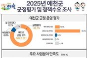 뉴스펀치 김종율 기자 | 예천군은 지난 9월 6일부터 5일간, 관내 주민들을 대상으로 실시한 ‘예천군 군정평가 및 정책수요 조사’ 결과, 군정 운영에 대한 만족도가 82.1%로 매우 높은 수준으로 나타났다고 밝혔다. 이번 조사는 민선8기 3년차를 맞아 군정 전반에 대한 평가와 앞으로 나아가야 할 주요 군정 방향 등 주민들의 실제 요구사항을 정책에 반영하기 위해 진행했다. 이를 통해 예천군은 정책 수립 목표를 구체화하고 주민들의 실질적인 삶의 질을 높일 수 있는 사업 개발의 근거 자료로 활용할 계획이다. 조사 결과, 응답자의 82.1%가 예천군의 군정 운영을 ‘잘하고 있다’고 평가했으며, 긍정적으로 평가한 응답자의 81.8%가 ‘주민 여가와 생활편의를 위한 공공시설 확충, 생활서비스 개선’ 분야에서 가장 높은 만족도를 보였다. 예천군 정주여건 중 가장 만족하는 분야는 주거환경 및 행정서비스로 43.5%가 긍정적으로 답했으며, 주민 소통과 업무처리에서는 ‘민원소통 및 업무처리에 만족한다’라는 응답이 84.5%로 나타났고, 군정성과에서는 문화・관광・체육 분야에 36.2%, 지역개발 분야에서는 34.1%로 긍정적인