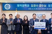뉴스펀치 박세훈 기자 | 경상국립대학교는 3월 17일 오전 9시 30분 대학본부 3층 접견실에서 김경수 국제협력부처장(제약공학과 교수)의 대학발전기금 전달식을 개최했다. 김경수 부처장은 이날 대학발전기금 1000만 원을 기부했다. 이날 행사에는 경상국립대학교 권진회 총장, 오재신 국제처장, 황정숙 국제협력과장 등 대학 관계자와 기부자인 김경수 부처장, 제약공학과 김철호 교수, 최지현 조교 등이 참석해 나눔의 의미를 더했다. 김경수 부처장은 2017년 제약공학과 교수로 임용된 이래, 교육과 연구는 물론 ‘케이원팜(K One Pharm) 주식회사’를 설립·운영하며 의약·약학 분야의 산학협력 활성화에 앞장서 왔다. 특히 현재 국제협력부처장으로서 경상국립대학교의 글로벌 경쟁력 강화와 국제적 위상 제고에 핵심적인 역할을 수행하고 있다. 김경수 부처장은 2004년부터 20년 넘게 ‘아름다운재단’ 등에 꾸준히 기부를 이어오며 나눔의 가치를 몸소 실천해 왔다. 이번 기탁은 그간의 사회 환원 활동을 자신이 몸담은 대학 공동체로 확대했다는 점에서 더욱 특별한 의미를 지닌다. 김경수 부처장은