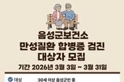 뉴스펀치 이현승 기자 | 음성군보건소는 만성질환자의 합병증을 조기에 발견하고 중증 심뇌혈관질환을 예방하기 위해 3월 3일부터 31일까지 ‘2026년 만성질환 합병증 검진 사업’ 대상자를 모집한다. 이번 사업은 고혈압·당뇨병·이상지질혈증 환자 410명을 대상으로 정밀 검진을 지원해 합병증 발생 위험을 사전에 확인하고, 체계적인 건강관리로 연계하기 위해 추진된다. 검진 항목은 △혈액검사(총콜레스테롤, 당화혈색소, 전해질 등) △소변검사(미세단백뇨) △안과검사(안저검사, 안압 측정 등) △경동맥 초음파 검사(고위험군 우선)로 구성돼 있다. 이 중 안과검사와 경동맥 초음파 검사는 협약 의료기관에 의뢰해 실시하는 위탁검사로 진행되며 모든 검사는 무료로 지원된다. 고혈압과 이상지질혈증은 자각 증상이 거의 없어 관리의 중요성을 놓치기 쉽고, 당뇨병 또한 장기간 방치할 경우, 망막병증·신장질환 등 심각한 합병증으로 이어질 수 있다. 특히 이러한 만성질환은 뇌졸중과 허혈성 심질환 등 중증 심뇌혈관질환의 주요 위험 요인으로 작용하는 만큼 정기적인 합병증 검진이 필수적이다. 검진 대상은 30세