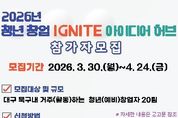 뉴스펀치 조평훈 기자 | 대구 북구청은 지역 청년들의 창업 열정과 혁신적인 아이디어 발굴을 지원하기 위해 오는 4월 24일까지 '청년 창업 Ignite 아이디어 허브' 참가자 20팀을 모집한다. 이번 사업은 지역 청년 (예비)창업자들이 보유한 창업 아이디어에 ‘점화(Ignite)’의 계기를 제공하여 사업화 가능성을 구체화하고 현실화할 수 있도록 단계별로 지원할 예정이다. 참가 대상은 2026년 청년놀이터 멤버십 회원 또는 창업놀이터 입주기업, 현재 39세 이하(1986년 3월 31일 이후 출생)인 북구 지역 청년 (예비)창업자이다. 북구 거주자․북구 소재 기업 재직자․북구 소재 대학생(휴학생)․북구 관내 창업 3년 미만 기업 중 1개 이상 요건을 충족하면 참가할 수 있으며, 이메일로 신청하면 된다. 선발된 팀에는 월 2회 이상의 협업 공간 이용 지원, 팀당 활동비 50만 원이 지원되며, 성과발표회를 통해 상위 7팀에는 총 310만 원 규모의 시상금이 수여될 예정이다. 배광식 북구청장은 “청년이 가진 아이디어 하나가 미래를 밝히는 불꽃이 될 수 있도록 지속적으로 청년이 도전할 기회를 제공하고 대구 북