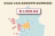 뉴스펀치 조평훈 기자 | 국토교통부와 4개 공공기관은 ’26년 수도권 공공택지에서 총 2.9만호 규모의 공공분양주택을 순차적으로 공급할 계획이라고 밝혔다. 이번 공급 물량은 새정부 「주택공급 확대방안」(9·7대책)에서 발표한 수치(2.7만호) 대비 약 2천호 증가한 규모로, 판교(2.9만호)급 신도시를 하나 새로 조성한 것에 준하는 수준이다. 특히, 4개 공공기관의 올해 분양 물량(2.2만호)보다 32.2% 증가했고, 최근 5년간 평균 수도권 분양 물량(1.2만호)의 약 2.3배 수준으로, 공공 부문의 착공 확대 노력의 성과가 가시화되며, 공급 확대 국면으로 전환되고 있음을 보여준다. 내년에 분양될 단지들을 살펴보면, 지역별로는 △서울 1.3천호, △인천 3.6천호, △경기 23.8천호로 분포되어 있고, 주요 지구별로는 △3기 신도시 7.5천호, △2기 신도시 7.9천호, △기타 중소택지 13.2천호의 공공주택이 분양될 예정이다. 3기 신도시에서는 △고양창릉(3,881호), △남양주왕숙(1,868호), △인천계양(1,290호), 2기 신도시에서는 △광교(600호), △평택고덕(5,134호), △화