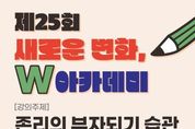 뉴스펀치 조평훈 기자 | 원주시는 오는 14일 오후 4시, 백운아트홀에서 ‘제25회 새로운 변화, W아카데미’를 개최한다. 새로운 변화, W아카데미는 다양하고 질 높은 평생교육의 기회를 제공하고, 원주시의 새로운 변화를 위한 지혜와 생각을 교류하는 토론의 장을 마련하고자 개설된 교육 프로그램으로, 매월 1회 열리고 있다. 이번 W아카데미에서는 경제 전문가 존리가 ‘존리의 부자되기 습관’을 주제로 강연을 진행할 예정이다. 별도 신청 없이 원주시민이라면 누구나 무료로 참석할 수 있다. 자세한 사항은 총무과 서무팀으로 문의하면 된다. 강정원 총무과장은 “많은 시민께서 참석하셔서 삶을 풍요롭게 만드는 지혜를 나누는 유익한 시간을 보내시길 기대한다”라고 말했다.