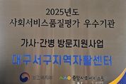 뉴스펀치 조평훈 기자 | 대구 서구지역자활센터는 보건복지부 주관 2025년 가사·간병 방문지원사업 품질 평가에서 전국 349개소 중 상위 9개소에 해당하는‘우수 기관’으로 선정됐다. 이번 평가는 ▲기관 운영 ▲제공 인력 및 인적자원관리 ▲서비스 제공 및 평가 ▲서비스 성과 ▲현장 평가단 등 5개 영역에서 실시됐으며, 서구지역자활센터는 전 영역에서 90점 이상의 높은 점수를 획득하며 탁월한 운영 역량을 입증했다. 우수 기관으로 선정된 서구지역자활센터는 포상금과 함께 보건복지부 장관 상장, 우수 기관 현판을 수여받는 영예를 안았다. 이는 지역사회 내 돌봄서비스의 질적 향상과 지속 가능한 가사간병방문지원사업 운영에 큰 동력을 제공할 것으로 기대된다. 류한국 서구청장은 “앞으로도 가사·간병 방문 지원 서비스 대상자에게 질 높은 서비스를 제공하고, 제공 인력인 요양보호사들에게 건강하고 내실 있는 일자리를 제공할 수 있도록 서구지역자활센터를 지속적으로 지원하겠다.”라고 밝혔다.