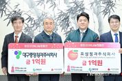 뉴스펀치 조평훈 기자 | 대구농수산물도매시장 법인 대구중앙청과㈜(대표 이용우, 이상윤)와 효성청과㈜(대표 김형수)는 1월 5일 대구광역시청 동인청사 접견실에서 대구사회복지공동모금회를 통해 총 2억 원(각 1억 원)의 희망 나눔 성금을 전달했다. 이날 전달식에는 김정기 대구광역시장 권한대행, 대구중앙청과 김태형 전무이사, 효성청과 김형수 대표, 신홍식 대구사회복지공동모금회장 및 김상덕 대구농수산물유통관리공사 사장을 비롯한 주요 관계자들이 참석해 자리를 빛냈다. 특히 이번 기부는 지난해보다 3배 이상 증액된 성금으로 경기 침체에도 불구하고 지역사회를 위한 나눔의 깊이를 더했다는 점에서 큰 의미가 있다. 대구중앙청과는 매년 성금 기부와 농산물 나눔, 연탄 나눔 등 다각적인 사회공헌활동을 전개하며, 관련 기부 내역과 사회공헌활동 현황을 체계적으로 관리해 투명한 나눔 경영을 이어가고 있다. 효성청과는 일회성 기부에 그치지 않고 지속적인 사회공헌활동을 펼쳐 왔다. 지난 추석에는 지역 어르신들을 위해 과일을 후원했으며, 지역 농가에 6,000만 원 상당의 안마의자(20여 대) 기부, 김장김치 지원