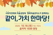 뉴스펀치 탁상훈 기자 | 가평군은 오는 18일 오전 10시부터 오후 3시까지 음악역 1939 광장에서 주민과 함께하는 축제 ‘2025년 같이, 가치 한마당’을 연다. 이번 행사는 사회적경제기업의 판로 확대와 마을공동체, 경기행복마을관리소의 활동 성과를 알리고 주민 참여를 확대하기 위해 마련됐다. 행사에는 사회적경제기업 5곳, 마을공동체 16곳, 경기행복마을관리소 4곳 등 총 25개 단체가 참여한다. 이날 주민들은 현장에서 직접 사회적경제기업의 제품을 구매할 수 있으며, 공동체별 특색 있는 프로그램을 즐길 수 있다. 주요 프로그램은 △사회적경제기업 생산품 홍보·판매 △공동체와 경기행복마을관리소 활동 전시 및 무료 체험 △합창·뮤지컬 갈라쇼·힐링체조 등 공연 △경품 이벤트 등이 마련돼 있다. 특히 가평마을교육공동체가 제작한 단편영화 상영 등 주민 주도 콘텐츠도 선보일 예정이다. 가평군 관계자는 “‘같이, 가치 한마당’ 축제를 통해 지역사회에서 사회적경제와 공동체 활동이 더욱 확산되기를 기대한다”며 “이번 행사가 지역경제의 활력으로 이어질 수 있도록 주민 여러분의 많은 방문과 성원을 부탁드린다”고 말했다