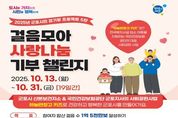 뉴스펀치 탁상훈 기자 | 군포시 산본보건지소는 오는 10월 13일부터 31일까지(19일간) 국민건강보험공단 군포지사와 함께하는 '걸음모아 사랑나눔' 기부챌린지를 운영한다. ‘걸음모아 사랑나눔’ 기부챌린지는 2023년부터 군포시와 국민건강보험공단 군포지사가 협력해 추진해 온 사회공헌형 걷기 사업이다. 시민들이 일상 속에서 걸음을 모아 목표를 달성하면 이를 기부로 연계해 취약계층에 전달하는 방식으로 진행되며 시민과 지역 내 기업·단체가 함께 참여해 건강한 나눔 문화를 지역사회에 확산시키고 있다. 기부챌린지는 군포시민 누구나 참여할 수 있으며 참여 기간은 10월 13일부터 31일까지이다. 참여방법은 워크온 앱을 설치한 뒤 ‘군포시 공식 커뮤니티’에 가입해 챌린지에 참여하면 된다. 챌린지 기간 동안 누적 목표 걸음 수 1억 5천만보를 달성하면 국민건강보험공단 군포지사에서 기부하는 총 100만 원의 기부금이 관내 아동복지시설과 지역아동센터 2곳에 전달될 예정이다. 김미경 군포시 보건소장은 “이번 챌린지는 단순히 건강을 위한 걷기를 넘어 시민 한 분 한 분의 발걸음이 모여 취약계층을 돕는 소중한 나눔으로 이어진다는 데 큰