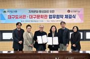 뉴스펀치 조평훈 기자 | 대구문학관과 대구도서관은 지난 1월 30일 독서문화 진흥과 지역문화 활성화를 위한 업무협약을 체결했다. 대구도서관에서 열린 이번 협약식에는 하청호 대구문학관 관장과 권현주 대구도서관 관장 외 각 기관의 실무자들이 참석하여, 두 기관의 상호협력 방안을 공유하며 지역 문학 및 문화예술의 가치 확산을 위한 활동을 공동으로 추진하는 데 뜻을 모았다. 양 기관은 이번 업무협약을 시작으로 앞으로 독서문화 진흥을 위한 사업 발굴 및 추진, 독서문화 프로그램 운영을 위한 전문 강사 및 인력 지원, 전시 및 문학 프로그램 운영 협업 활동을 함께 적극적으로 펼쳐 나갈 계획이다. 양 기관의 대표는 “지역에서 독서 및 문학향유의 중심에 선 두 기관 간의 이번 업무협약을 계기로 앞으로 양질의 창의적인 프로그램 개발을 통해 서로 간의 인적, 물적 교류가 활발하게 이루어져 지역의 독서문화를 선도해 갈 수 있기를 희망한다.”고 이번 업무협약에 대한 기대를 밝혔다.