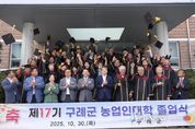 뉴스펀치 김길룡 기자 | 전남 구례군은 지난 10월 30일 기후변화 및 탄소중립 실천 농업인 육성을 목표로 운영해 온 2025년 구례군 농업인대학 졸업식을 개최했다. 이날 졸업식에는 김순호 군수, 장길선 의장, 내빈과 졸업생 등이 참석한 가운데 경과보고, 졸업증서 수여, 축사 순으로 진행됐다. 올해 농업인대학은 ‘친환경 흙 살리기 과정’으로 운영됐으며, 지난 3월 6일 입학식을 시작으로 10월까지 총 25회에 걸쳐 진행됐다. 교육과정은 토양의 구성 및 관리, 토양시비처방서의 이해, 토양 현장진단법, 친환경농자재 실습 등 농업 현장에서 바로 활용할 수 있는 실용 중심의 내용으로 구성됐다. 졸업식에는 36명의 교육생이 교육과정을 이수하며 졸업의 결실을 맺었다. 또한 자치활동과 학습분위기 조성에 기여한 공로를 인정받아 정창현(마산면) 씨가 농촌진흥청장상을, 신한진(문척면) 씨, 김해중(문척면) 씨, 박정남(용방면) 씨가 군수상을 각각 수상했다. 구례군 농업인대학은 2009년 개설 이후 올해까지 17년간 총 21개 과정, 802명의 졸업생 배출했으며 지역 농업의 경쟁력 강화를 위한 품목별 맞춤