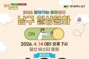 뉴스펀치 조평훈 기자 | 대구 남구는 지역 주민들에게 일상 속 문화 향유 기회를 확대하고, 지역 예술가들의 공연 활동을 지원하기 위해 ‘2026 찾아가는 문화공연’ 을 개최한다. 관내 신규 입주 공동주택을 대상으로 공연을 희망하는 아파트 단지를 선정하였으며, 오는 4월 14일(화) 앞산비스타동원 아파트에서 첫 공연을 진행할 예정이다. 저녁 7시에 열리는 ‘앞산비스타동원 음악회’에서는 인기 개그맨 김재롱이 사회를 맡고, 지역 가수 이새벽과 미스트롯 4 출연자 장혜리 가수가 공연을 펼친다. 또한, 아파트 입주 후 처음으로 열리는 주민 참여 행사인만큼 입주자 대표회에서도 다양한 경품과 선물을 준비하여 주민 화합의 장을 만들 예정이다. 조재구 남구청장은 “대규모 축제나 행사도 중요하지만, 주민들이 사는 가까운 동네에서 편하게 문화예술을 접할 수 있도록 찾아가는 문화행정을 적극 추진하겠다.”라며, “아파트로 찾아가는 음악회를 통해 주민들이 일상에서 소소한 행복을 느끼며 힐링할 수 있기를 바란다.”라고 전했다. ‘찾아가는 문화공연’에 대한 문의는 남구 문화관광과 문화예술팀으로 연락하면 안내받을 수 있다.