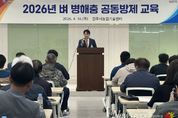 뉴스펀치 박세훈 기자 | 진주시는 16일 오후 농업기술센터에서 벼 병해충 피해를 최소화하고 체계적인 공동방제를 추진하기 위해 ‘2026년 벼 병해충 공동방제 교육’을 실시했다고 밝혔다. 이번 교육은 진주시농업기술센터가 본격적인 방제 시기를 앞두고 안전하고 효율적인 공동방제 추진을 위해 마련됐으며, 관내 들녘 별 공동방제 보조 사업자와 항공방제사 등 100여 명이 참석한 가운데 실무 중심의 교육으로 진행됐다, 이날 교육에서는 병해충의 발생 시기별 주요 특징과 효과적인 방제 요령을 비롯해 현장에서 자주 발생하는 민원 사례 등을 중심으로 실질적인 내용을 다뤘다. 또한 농약 사용과 항공방제에 적용되는 관련 법규는 물론 안전관리 지침을 안내하는 등 현장에서 바로 활용할 수 있는 실무 정보를 제공해 호응을 얻었다. 이와 함께 지난해 방제 과정에서 제기된 현장의 애로사항과 개선 사례를 공유하며 참여자들이 경험과 정보를 나누고, 보다 효율적인 방제 방안을 모색하는 시간도 마련됐다. 또한 시는 지난해 가을의 고온과 잦은 비로 볍씨 여뭄이 좋지 않았던 점을 고려해 올해 벼의 안전 육묘를 위한 종자소독과 육묘 관리의