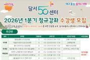 뉴스펀치 조평훈 기자 | 대구 달서구는 12월 15일부터 24일까지 ‘2026년 1분기 달서50플러스센터 정규강좌’ 수강생을 선착순 모집한다. 달서50플러스센터는 50~64세 세대의 역량 강화와 자기계발을 지원하기 위한 평생교육 기관으로, 매 분기 다양한 교육 프로그램을 운영하고 있다. 이번 1분기에는 ▲자격증 ▲디지털 ▲어학 ▲음악·미술 ▲기획특강 등 9개 분야 총 28개 강좌가 개설된다. 교육은 2026년 1월 12일부터 3월 30일까지 강좌별 10주 과정으로 진행되며, 수강생들의 관심과 요구를 반영해 디지털·어학 분야와 직장인을 위한 야간 강좌가 확대 운영될 예정이다. 신청 대상은 주민등록상 달서구에 거주하는 50~64세 주민(50플러스세대)이며, 수강료는 전 과정 무료다. 수강 신청은 인터넷 접수 또는 전화 접수로 가능하며, 자세한 내용은 구청 홈페이지 통합예약 시스템 또는 달서50플러스센터를 통해 확인할 수 있다. 이태훈 달서구청장은 “이번 교육 프로그램을 통해 지역의 50플러스세대가 더욱 건강하고 즐겁게, 자기 주도적인 삶을 살아가는 데 도움이 되기를 바란다”고