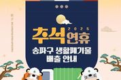 뉴스펀치 김완규 기자 | 서울 송파구는 추석 연휴를 맞아 오는 10월 10일까지 ‘청소종합대책’을 추진한다고 29일 밝혔다. 우선, 연휴를 앞두고 29일부터 10월 2일까지 주민들과 함께 취약지역을 중심으로 대청소를 실시한다. 각 동주민센터 직원들과 직능단체, 주민자율청소단, 자원봉사자들이 동네 구석구석을 청소해 손님 맞을 준비에 나선다. 귀성객이 많이 이용하는 주요 도로, 대로변은 구 차원에서 집중 청소한다. 연휴 기간인 10월 3일부터 9일까지는 청소상황실을 운영한다. 생활쓰레기 민원을 신속히 처리하고, 가로 청소와 무단투기 단속을 강화한다. 청소 기동반도 운영해 긴급 수거 요청 등에 대응한다. 생활폐기물 수거는 수도권매립지와 소각시설 휴무로 10월 4일부터 6일까지는 중단된다. 이에 따라 ▲종량제봉투 ▲음식물쓰레기 ▲재활용품 ▲대형폐기물 배출도 금지된다. 10월 3일까지 배출한 후에는 7일 오후 6시 이후부터 다시 배출할 수 있다. 연휴가 끝난 10월 10일에는 청소 인력과 장비를 총동원해 연휴 중 밀린 쓰레기를 전량 수거할 방침이다. 추석 연휴 생활폐기물 배출 안내는 송파구청 누