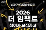 뉴스펀치 박상훈 기자 | 서울 송파구는 재능 있는 청년예술인을 발굴·지원하는 ‘2026 더 임팩트’ 참가자를 오는 3월 6일 오후 5시까지 모집 중이라고 23일 밝혔다. 이번 공모는 지난 2월 10일부터 접수가 진행되고 있다. 올해로 4년차를 맞는 ‘더 임팩트’는 송파구가 주관하는 청년예술인 지원 사업이다. 청년예술가에게는 활동 무대를 제공하고, 주민들에게는 일상 가까이에서 문화예술을 만날 기회를 넓히는 프로그램이다. 지난해에는 공모를 통해 선발된 37개 팀 74명의 청년예술인들이 석촌호수 아뜰리에와 문화실험공간 호수 등에서 공연과 전시를 선보이며 큰 호응을 얻었다. 공연 33회·전시 5회를 운영해 약 1만여 명의 관람객을 모으는 성과를 거뒀으며, 이를 바탕으로 올해 ‘더 임팩트’는 더욱 내실 있게 운영될 예정이다. 최종 선발된 40인(팀)은 활동 지원금을 받고 오는 12월까지 송파구 문화시설에서 공연·전시를 이어간다. 이를 통해 청년예술인의 활동 기반을 넓히고 지역 문화예술 저변 확대에도 나설 계획이다. 참가 대상은 대한민국 국적 만 19세 이상, 만 39세 이하의 전문예술가다. △국악 및 서양