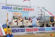 뉴스펀치 김용희 기자 | 전남 나주시가 본격적인 영농철을 앞두고 농업인의 화합과 결속을 다지며 풍년 농사를 기원하는 영농발대식을 개최했다. 나주시는 지난 25일 영산강둔치체육공원에서 ‘2026년 농업인 영농발대식’을 열고 한 해 농사의 시작을 알렸다고 26일 밝혔다. 이번 행사는 나주농민회(회장 박용래)와 나주시여성농민회(회장 송숙희)가 공동 주관했으며 지역 농업인과 시민 등 1500여 명이 참석해 새로운 농사의 출발을 함께했다. 영농발대식은 매년 영농철을 앞두고 농업인의 무사 안녕과 풍년을 기원하고 영농 의지를 다지는 나주시 대표 농업 행사로 자리잡고 있다. 특히 기후변화와 농자재 가격 상승, 농촌 고령화와 인력 부족 등 어려운 여건 속에서 농업인의 사기를 높이고 지속 가능한 농업 발전 의지를 다지는 의미를 더했다. 이날 행사는 풍물패 길놀이 공연을 시작으로 나주시립국악단 축하공연과 고천제가 이어지며 한 해 풍년과 농업인의 안녕을 기원했다. 기념식에서는 농민회장과 여성농민회장의 대회사와 함께 전농 광주전남연맹 의장의 격려사, 농업 발전과 농민 권익 향상을 위한 결의문이 낭