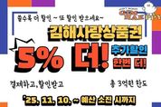뉴스펀치 김길룡 기자 | 김해시는 오는 10일부터 김해사랑상품권 결제금액의 5%를 김해사랑상품권으로 환급(캐시백)하는 추가 할인 행사를 추진한다고 6일 밝혔다. 지역사랑상품권 국비지원 발행분 판매실적 우수 지자체로 선정돼 추가 인센티브를 교부받아 이뤄지는 행사이다. 추가 인센티브는 1차 정부 추경예산 지원을 받아 발행한 지역사랑상품권 8월 말 기준 판매실적 평가 결과에 따른 것으로, 총 300억 원 규모로 전국 33개 지자체가 선정됐으며 경남에서 김해시가 유일하다. 추가 할인은 김해사랑상품권뿐 아니라 김해공공배달앱상품권, 김해온몰상품권 결제금액에도 동일하게 적용된다. 이번 행사는 3억 원 규모로 예산 소진 전까지 진행되며 환급은 추가할인 종료 이후인 12월 중 일괄 지급 예정이다. 시는 앞서 지난 10월 29일부터 9일까지 ‘코리아그랜드페스티벌’과 연계해 김해사랑상품권 추가환급 행사를 진행하고 있으며 이번 추가할인은 그 연장선에서 지역 소상공인 매출 증대와 시민 소비 촉진에 큰 도움이 될 것으로 기대된다. 시 관계자는 “이번 추가할인은 전국적으로 우수한 판매실적을 인정받아